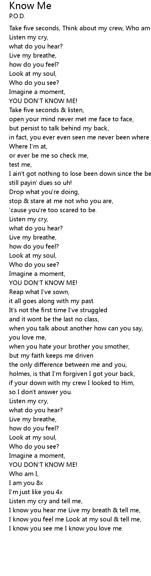 | Take five seconds, Think about my crew, Who am I...P.O.D. | |