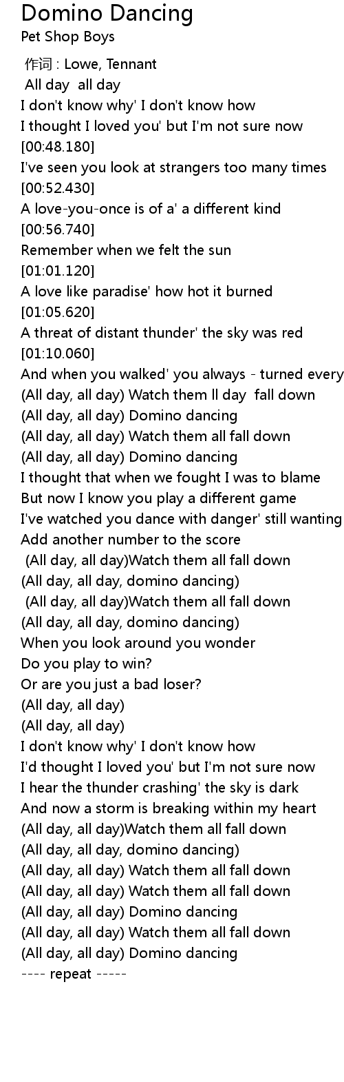 | [03:30.330] | (All day, all day) Watch them all fall down |