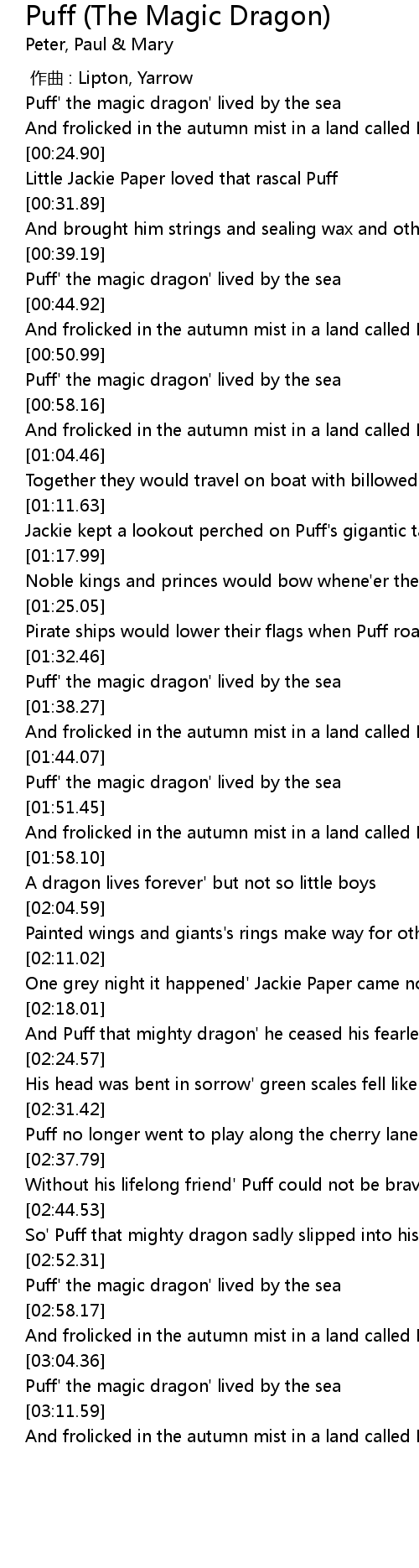 | [02:45.72] | So' Puff that mighty dragon sadly slipped into his cave' oh |