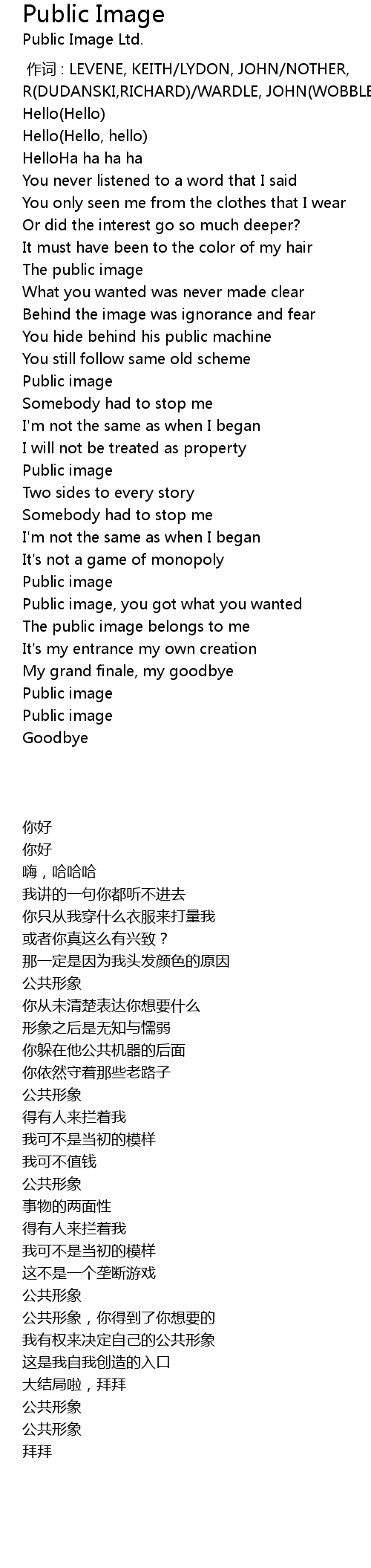 | [00:00.00] | 作词 : LEVENE, KEITH/LYDON, JOHN/NOTHER, R(DUDANSKI,RICHARD)/WARDLE, JOHN(WOBBLE,JAH) |