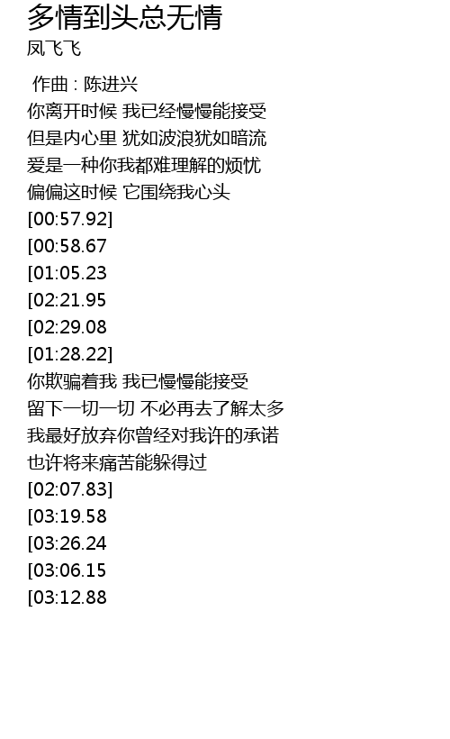 | [02:42.42][02:29.08][01:19.05] | 这份多情留给自己总无情 |