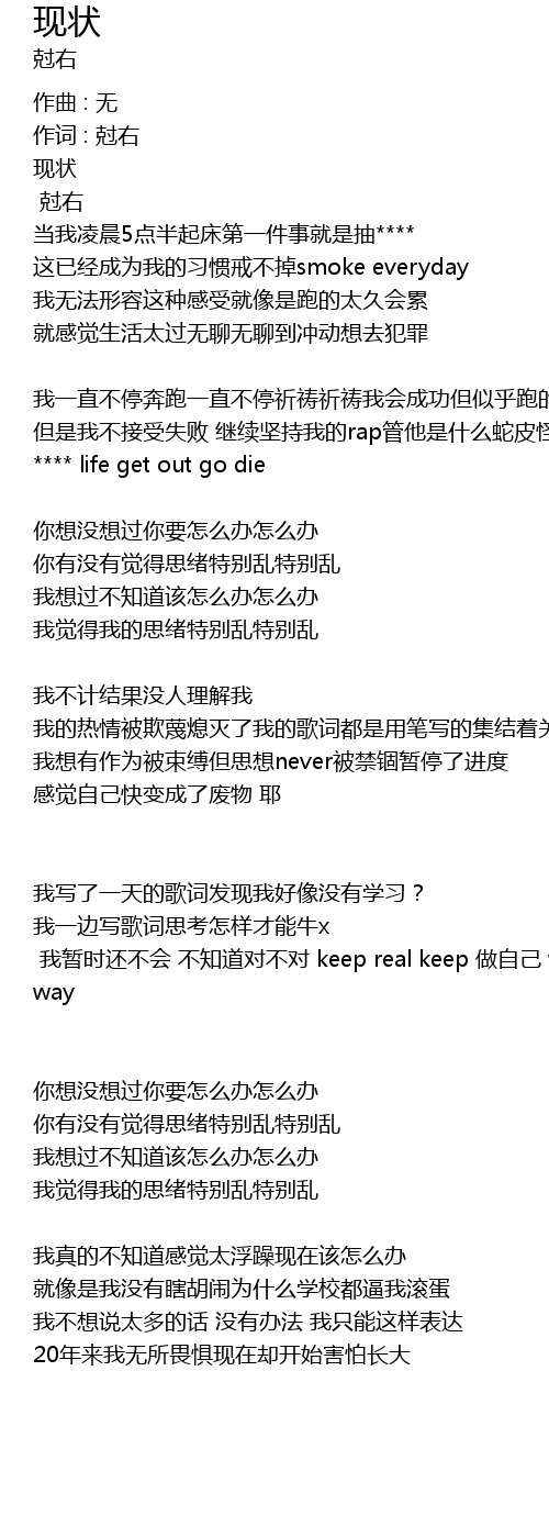 | 我不计结果没人理解我 我的热情被欺蔑熄灭了我的歌词都是用笔写的集结着关于个人的态度 我想有作为被束缚但思想never被禁锢暂停了进度 感觉自己快变成了废物 耶 | |