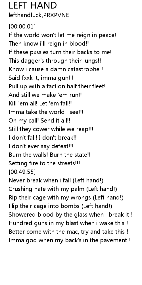 | [01:13.96] | Rip their cage with my wrongs Left hand! |