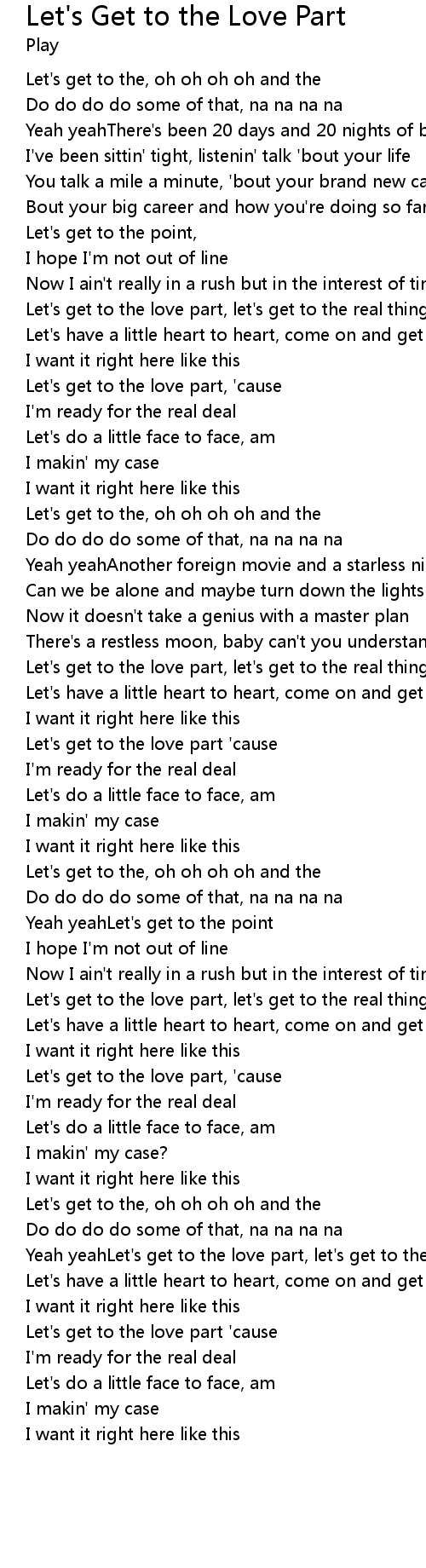 | Yeah yeahLet's get to the love part, let's get to the real thing | |