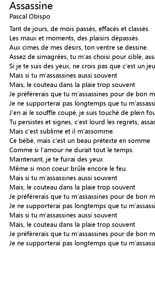 | Tu persistes et signes, c' est lourd les regrets, assassine. | |