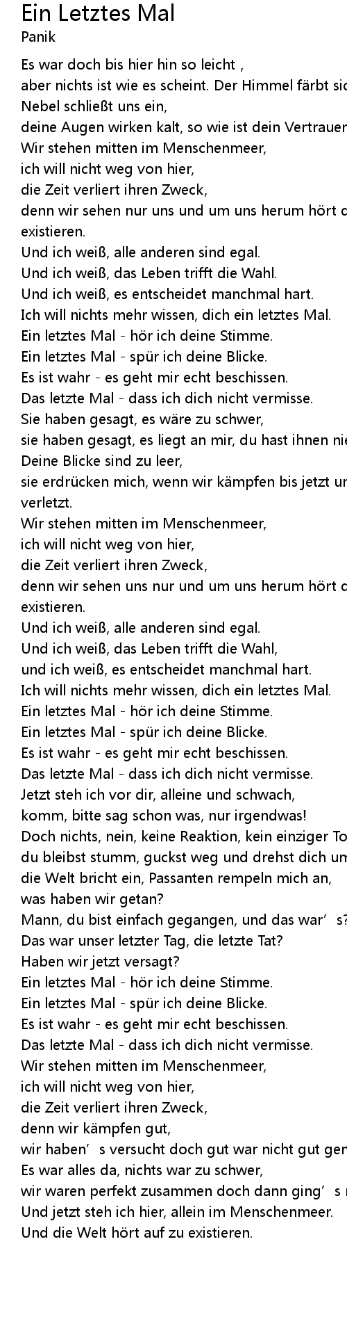 | [03:04.87] | Das letzte Mal dass ich dich nicht vermisse. |