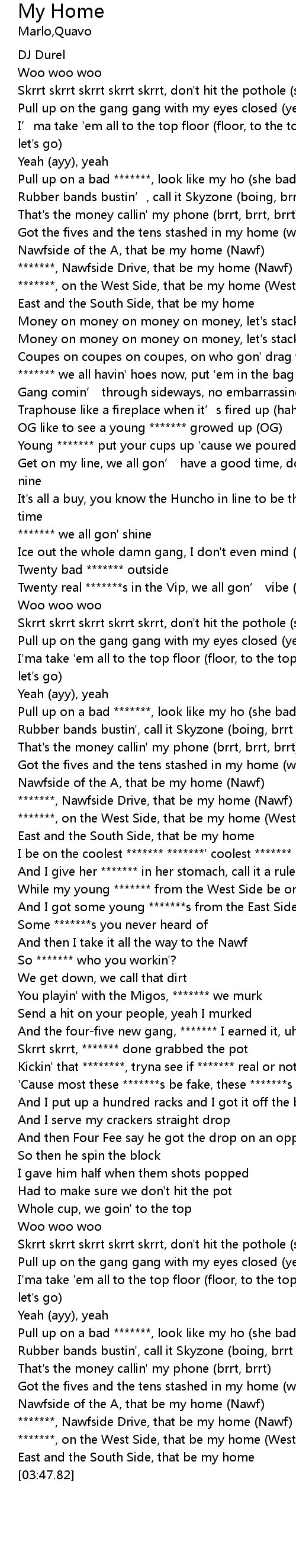 | [00:46.77] | *******, Nawfside Drive, that be my home (Nawf) |