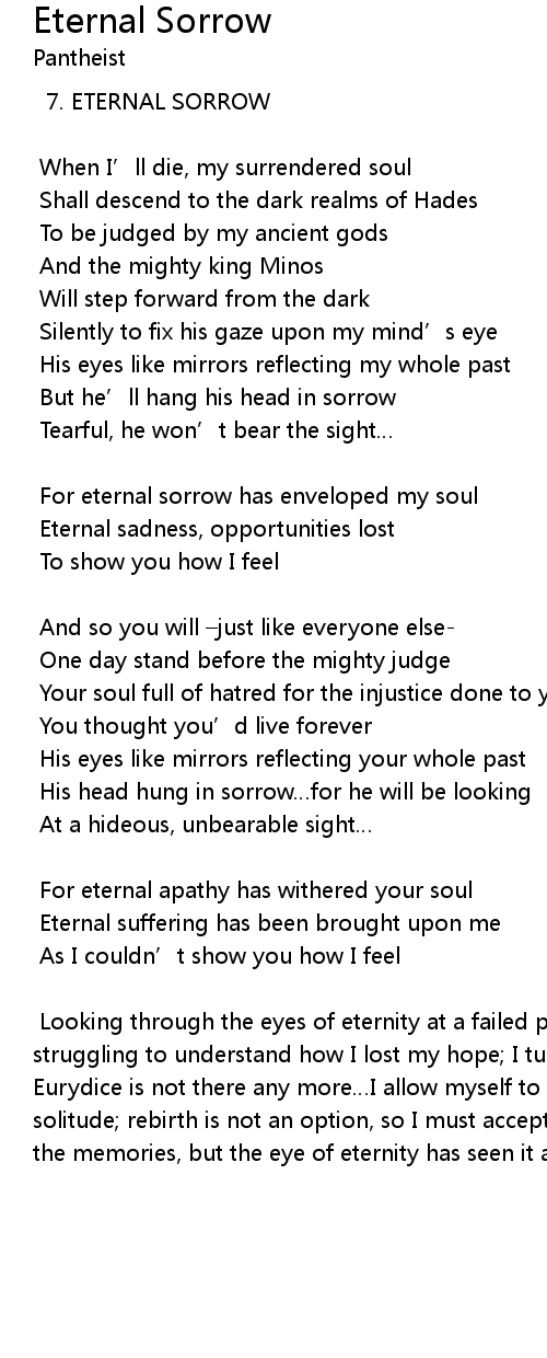 | Looking through the eyes of eternity at a failed past that can' t be undone struggling to understand how I lost my hope I turn to look behind me, but my Eurydice is not there any more I allow myself to float on the waves of solitude rebirth is not an option, so I must accept. The wind shall carry away the memories, but the eye of eternity has seen it all |