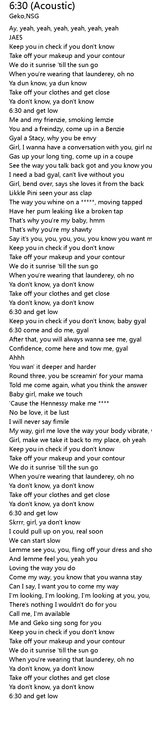 | [01:29.72] | 6:30 come and do me, gyal |