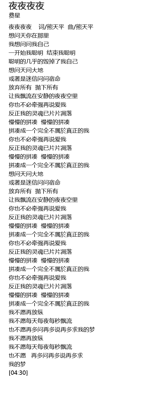 | [00:00] | 夜夜夜夜 词/熊天平 曲/熊天平 |