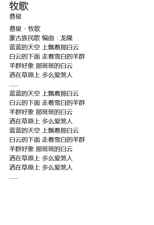 | [00:06.68] | 蒙古族民歌 编曲:龙隆 |