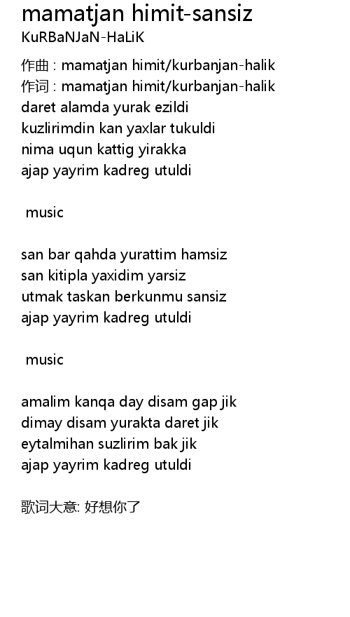 | 作词 : mamatjan himit/kurbanjan-halik | |