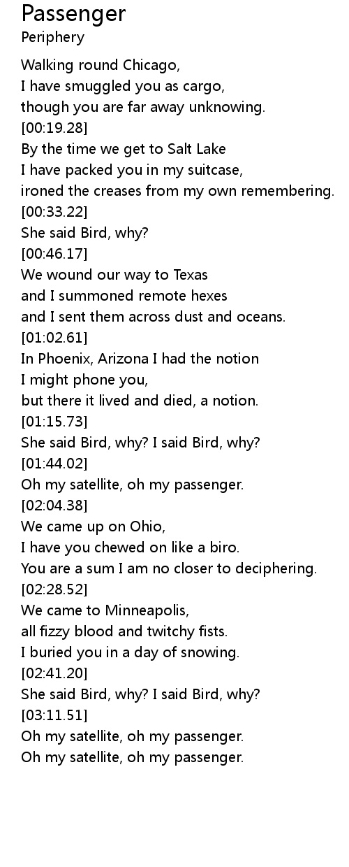 | [03:27.85] | Oh my satellite, oh my passenger. |
