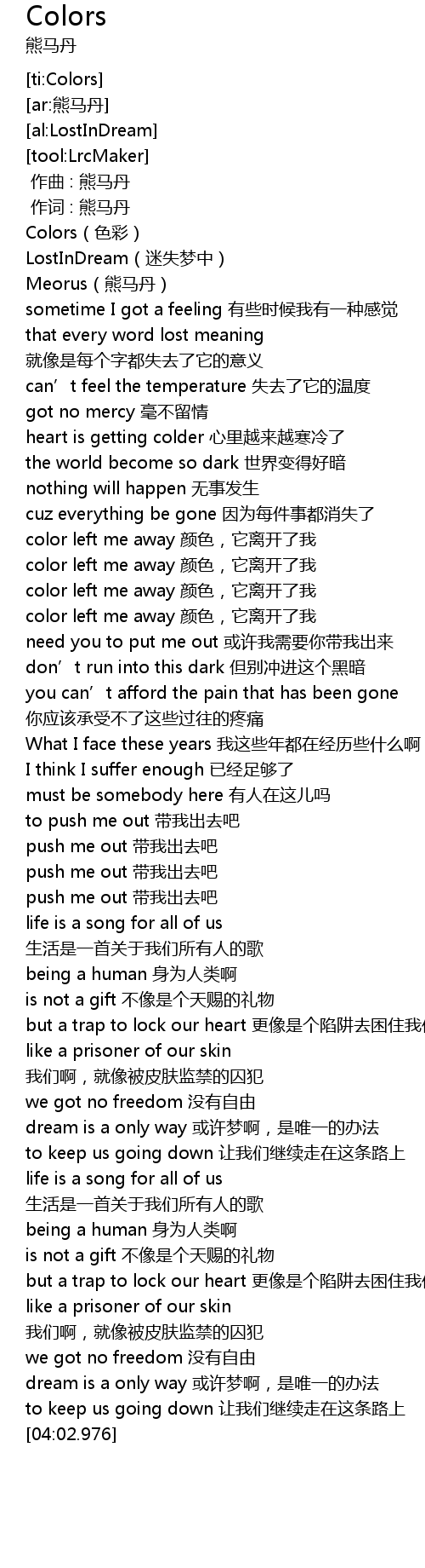 | [01:16.435] | color left me away 颜色,它离开了我 |
