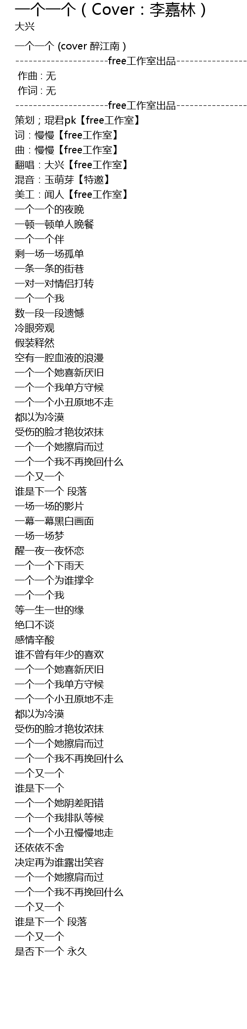 | [00:13.04] | 翻唱:大兴【free工作室】 |