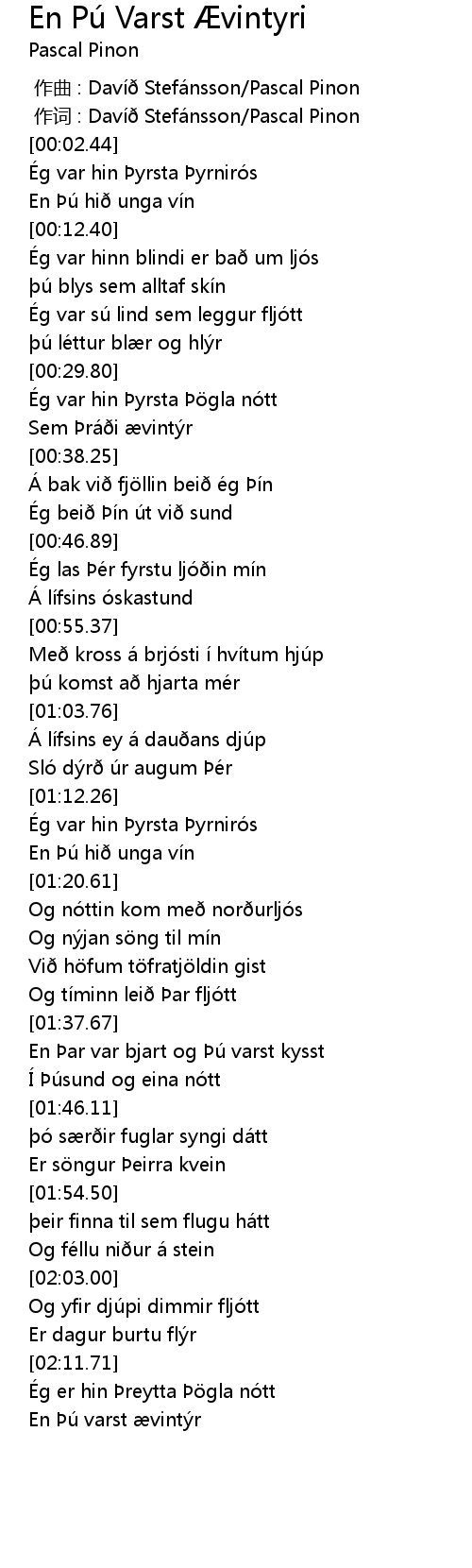 | [00:00.681] | 作词 : Davíð Stefánsson/Pascal Pinon |