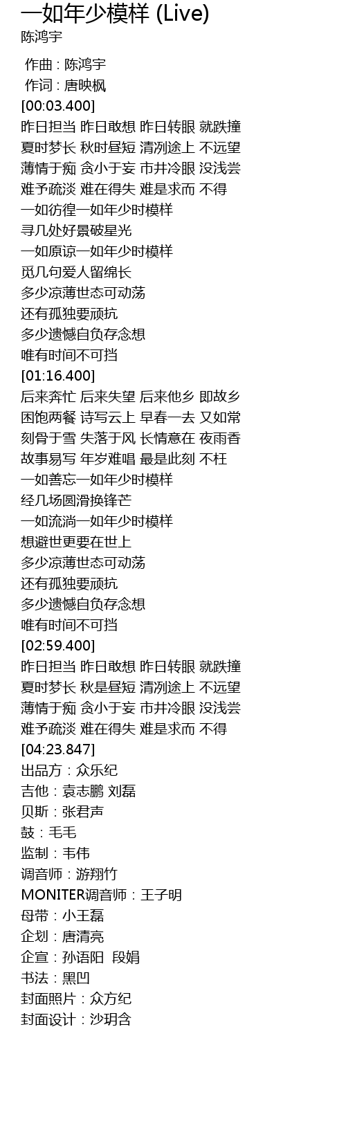 | [00:43.745] | yī rú yuán liàng yī rú nián shào shí mú yàng |