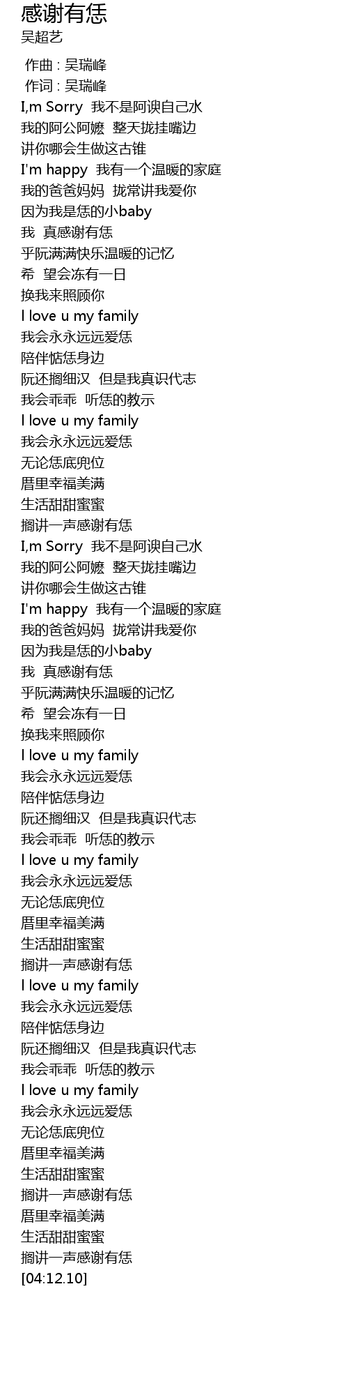 | [00:33.49] | I'm happy 我有一个温暖的家庭 |