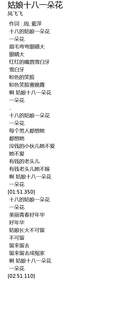 | [02:34.550] | a gū niáng shí bā yī duǒ huā |