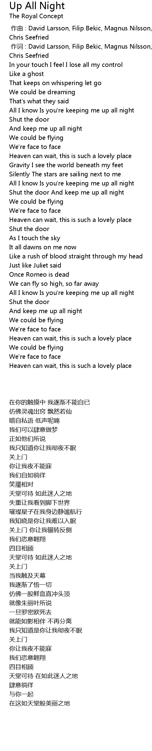 | [01:38.57] | All I know Is you' re keeping me up all night |