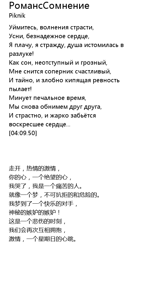 | [00:57.37] | Я плачу, я стражду, душа истомилась в разлуке! |