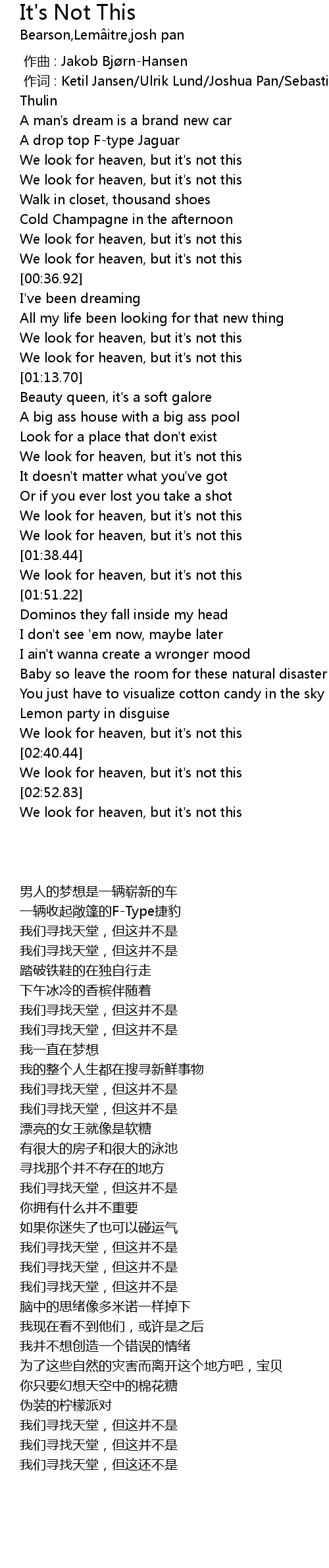 | [00:34.01] | We look for heaven, but it' s not this |