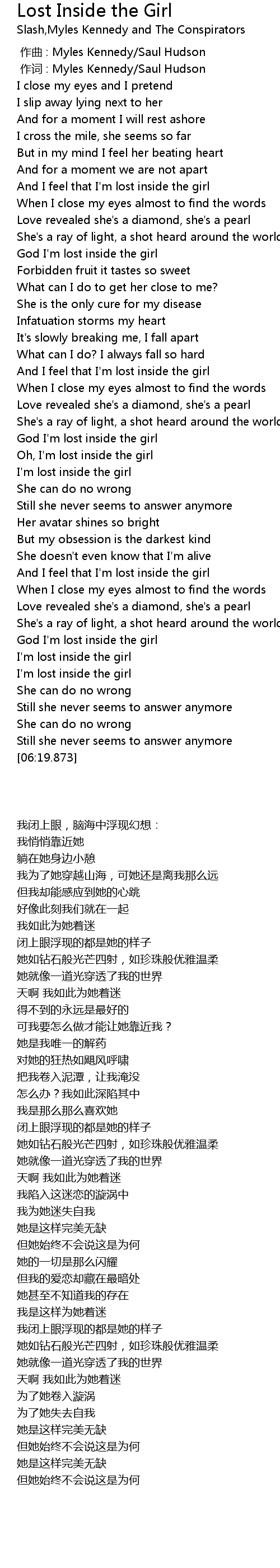 | [02:17.253] | And I feel that I' m lost inside the girl |