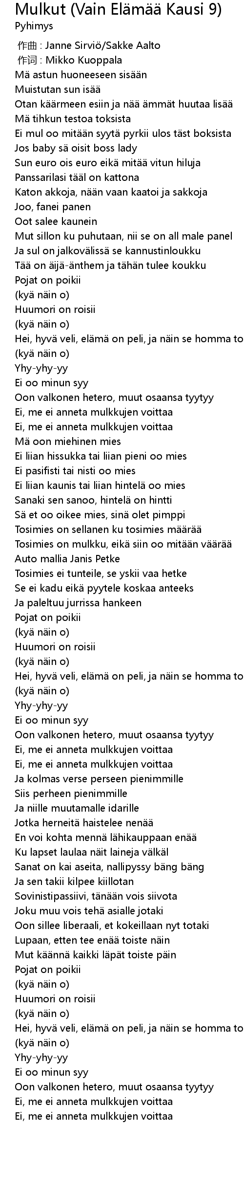 | [01:47.42] | Oon valkonen hetero, muut osaansa tyytyy |