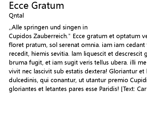 Cupidos Zauberreich." Ecce gratum et optatum ver reducit gaudia: purpuratum floret pratum, sol serenat omnia. iam iam cedant tristia! estas redit nunc recedit, hiemis sevitia. lam liquescit et descrescit grando, nix et cetera; bruma fugit, et iam sugit veris tellus ubera. illi mens est misera, qui nec vivit nec lascivit sub estatis dextera! Gloriantur et letantur in melle dulcedinis, qui conantur, ut utantur premio Cupidinis. simus iussu Cypridis gloriantes et letantes pares esse Paridis! [Text: Carmina Burana]