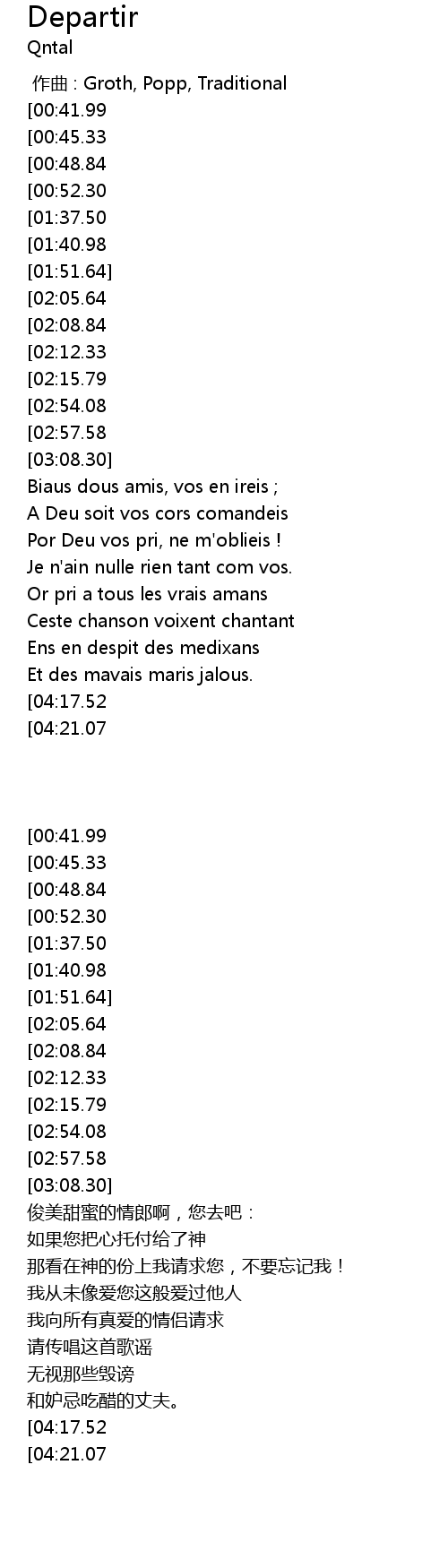 | [03:04.35][02:57.58][02:50.50][02:43.66] | Amins, ke me depairt de vos. |