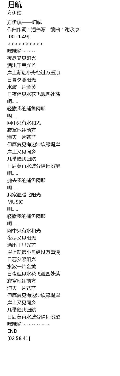 | [00:41.46] | 轻撒我的捕鱼网耶 |