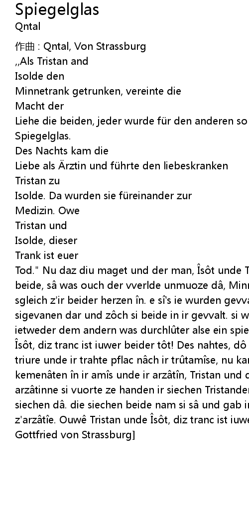 | Tod." Nu daz diu maget und der man, s t unde Tristan, den tranc getrunken beide, s was ouch der vverlde unmuoze d, Minne, aller herzen l gaer n, und sgleich z' ir beider herzen n. e s' s ie wurden gevvar, d stiez s' ir sigevanen dar und z ch si beide in ir gevvalt. si wurden ein und einvalt, daz ietweder dem andern was durchl ter alse ein spiegelglas. Ouw Tristan unde s t, diz tranc ist iuwer beider t t! Des nahtes, d diu schoene lac, ir triure unde ir trahte pflac n ch ir tr tam se, nu kam geslichen l se zuo der kemen ten n ir am s unde ir arz t n, Tristan und diu Minne. Minne diu arz tinne si vuorte ze handen ir siechen Tristanden. ouch vant s' s te ir siechen d. die siechen beide nam si s und gab in ir, im sie ein ander z' arz t e. Ouw Tristan unde s t, diz tranc ist iuwer beider t t! Text : Gottfried von Strassburg |