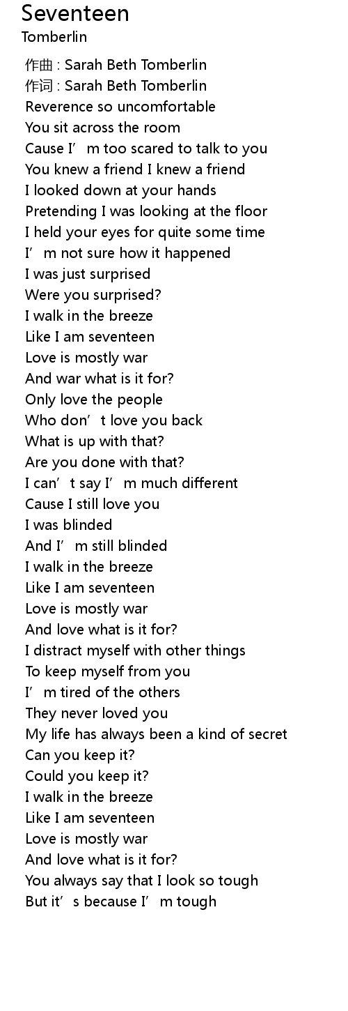 | [00:01.000] | 作词 : Sarah Beth Tomberlin |