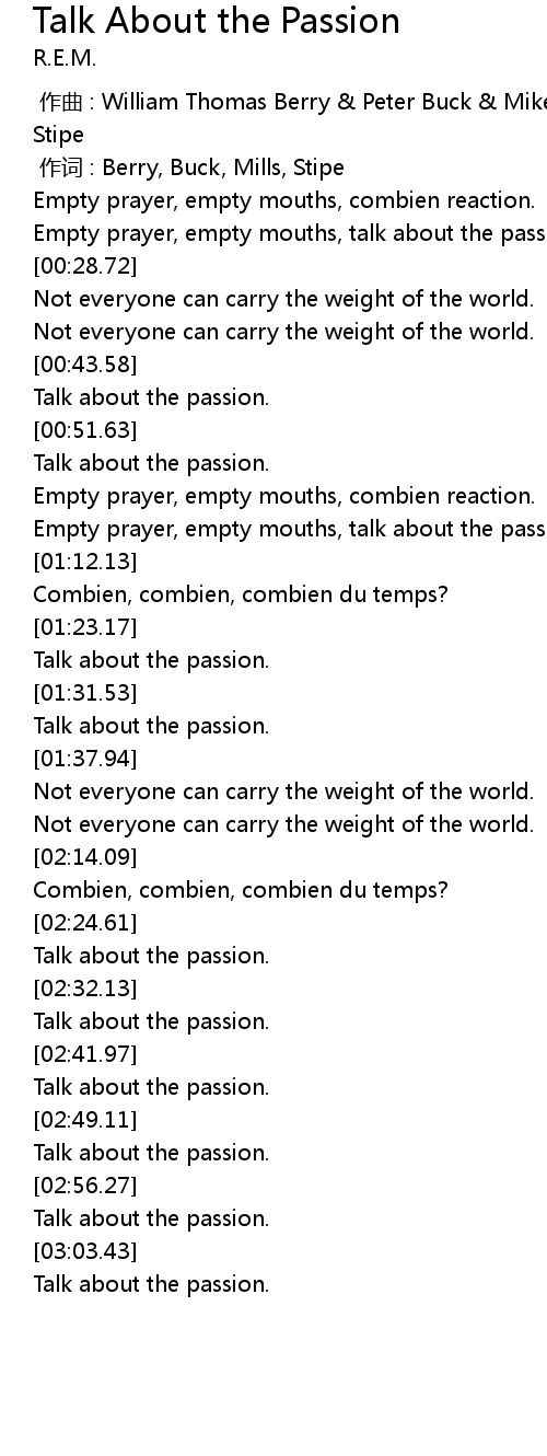 | [00:00.00] | zuò qǔ : William Thomas Berry Peter Buck Mike Mills Michael Stipe |