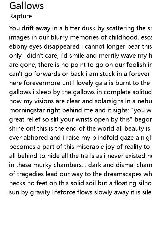 You drift away in a bitter dusk by scattering the snow that held angel-like images in our blurry memories of childhood. escaping every when, who or why ebony eyes disappeared i cannot longer bear this as it revels in my misery if only i didn't care, i'd smile and merrily wave my hand goodbye my possessions are gone, there is no point to go on our foolish intents built my future plans i can't go forwards or back i am stuck in a forever dying moment more ...i sway here forevermore until lovely gaia is burnt to the core you'll find me at the gallows i sleep by the gallows in complete solitude that i used to cherish but now my visions are clear and solarsigns in a nebular hill cast a fallen morningstar right behind me and it sighs: "you won't feel a thing, it is only great relief so slit your wrists open by this" begone at the silent shores. shine on! this is the end of the world all beauty is lost and so is all you had ever abhored and i raise my blindfold gaze a night mare of ending my life becomes a part of this miserable joy of reality to sell my fortune to leave them all behind to hide all the trails as i never existed nothing remains irrelevant in these murky chambers... dark and dismal chambers of agony a cruel gathering of tragedies lead our way to the dreamscapes where they feed the rope by our necks no feet on this solid soil but a floating silhouette against the setting sun by gravity lifeforce flows slowly away it is silent at the gallows again |