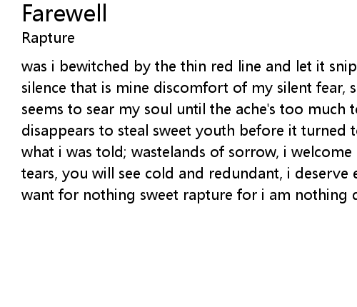 was i bewitched by the thin red line and let it snip the silver twine i stare in silence that is mine discomfort of my silent fear, so icy cold, yet somehow seems to sear my soul until the ache's too much to bear, as mortal life now disappears to steal sweet youth before it turned to gold. existence now is not what i was told; wastelands of sorrow, i welcome all i receive blood before tears, you will see cold and redundant, i deserve everything i get what joy, want for nothing sweet rapture for i am nothing desolation is a delicate thing |