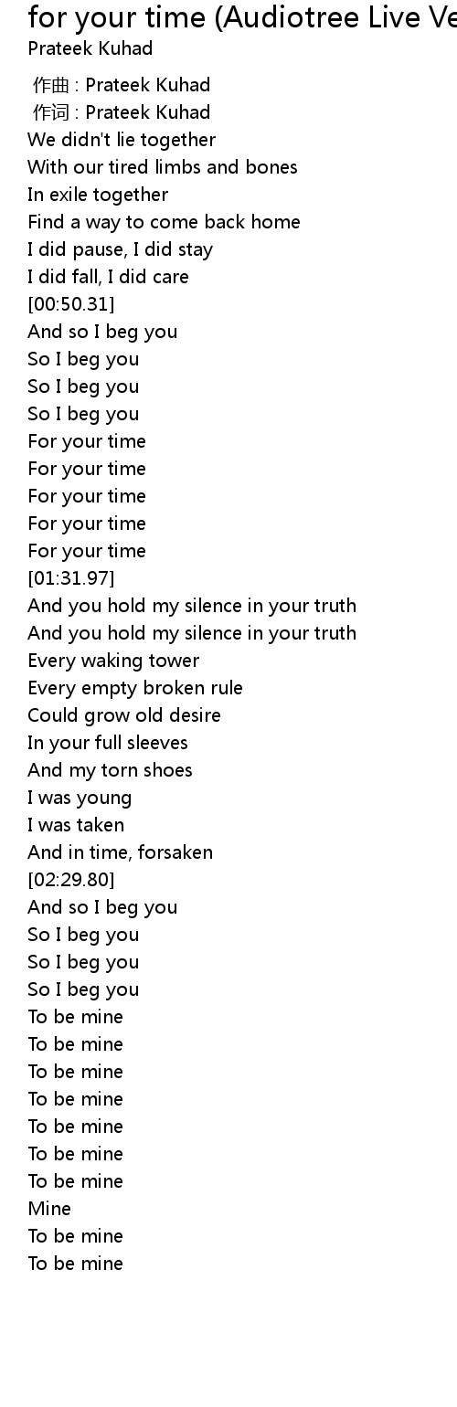 | [00:00.000] | 作曲 : Prateek Kuhad |