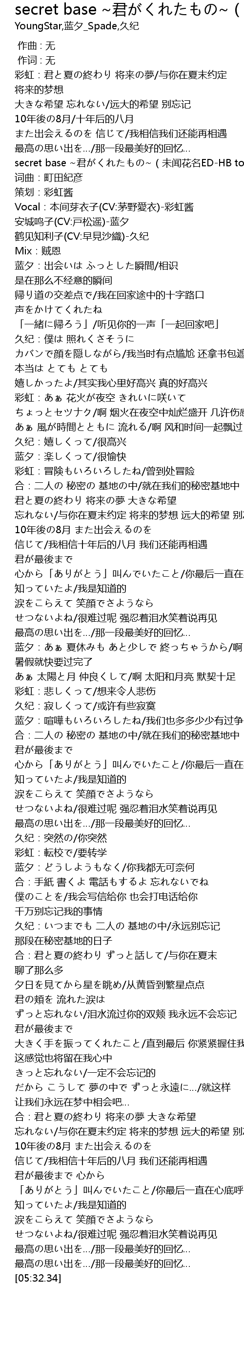 | [00:22.49] | secret base ~君がくれたもの~(未闻花名ED-HB to 面码) |