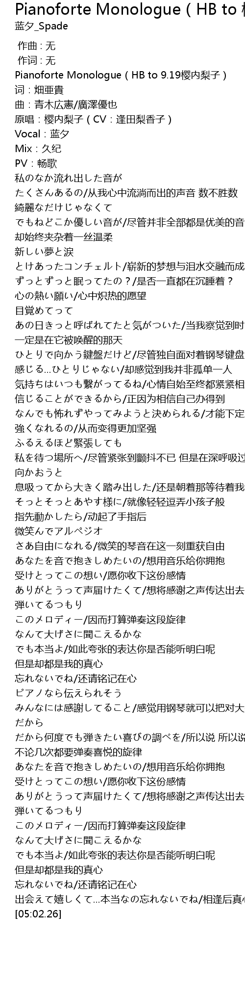 | [00:00.68] | Pianoforte Monologue HB to 9. 19 yīng nèi lí zǐ |