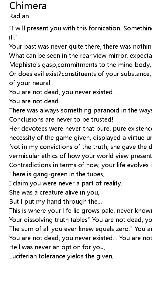 | The sum of all you ever knew equals zero." You are not dead, you neverexisted. You are not dead, you never existed... You are not dead, you never existed." | |