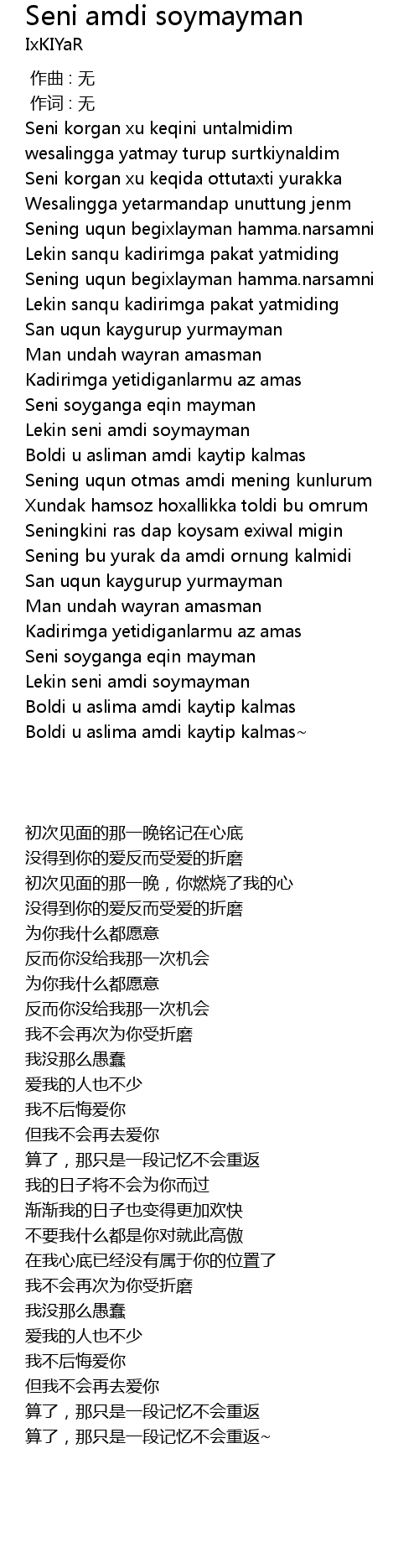 | [00:38.821] | Seni korgan xu keqida ottutaxti yurakka |