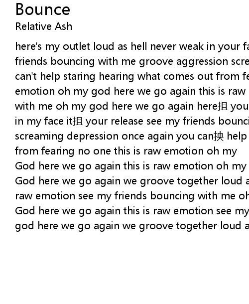 | here' s my outlet loud as hell never weak in your face it' s our release see my friends bouncing with me groove aggression screaming depression once again you can' t help staring hearing what comes out from fearing no one this is raw emotion oh my god here we go again this is raw emotion see my friends bouncing with me oh my god here we go again here zha your outlet loud as hell never weak in my face it zha your release see my friends bouncing with me groove aggression screaming depression once again you can yang help staring hearing what comes out from fearing no one this is raw emotion oh my | |