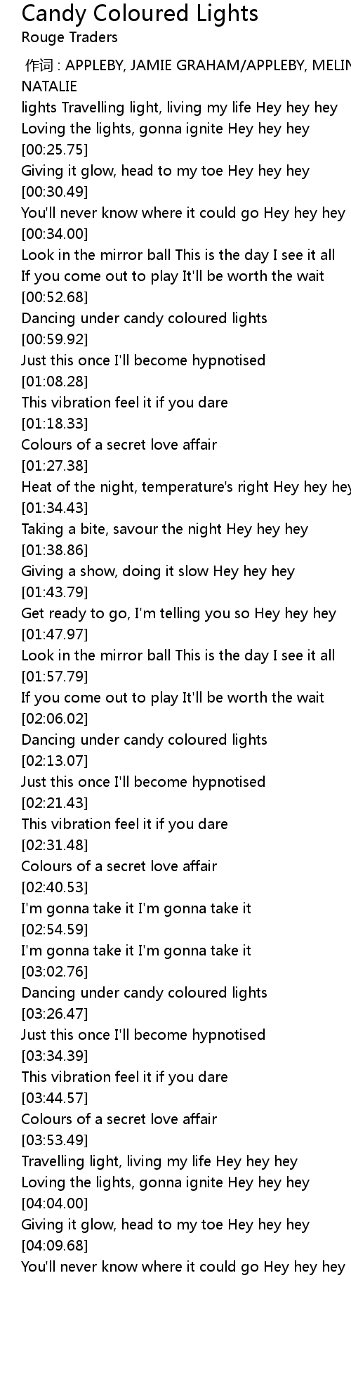 | [00:18.64] | lights Travelling light, living my life Hey hey hey |