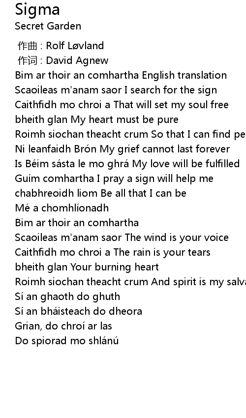 | [00:43.240] | Is Bé im sá sta le mo ghrá My love will be fulfilled |