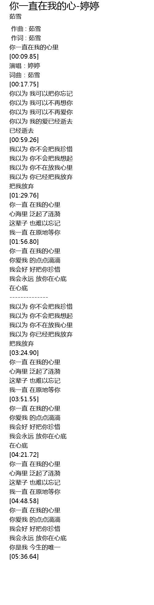 | [04:49.95] | nǐ yī zhí zài wǒ de xīn lǐ |