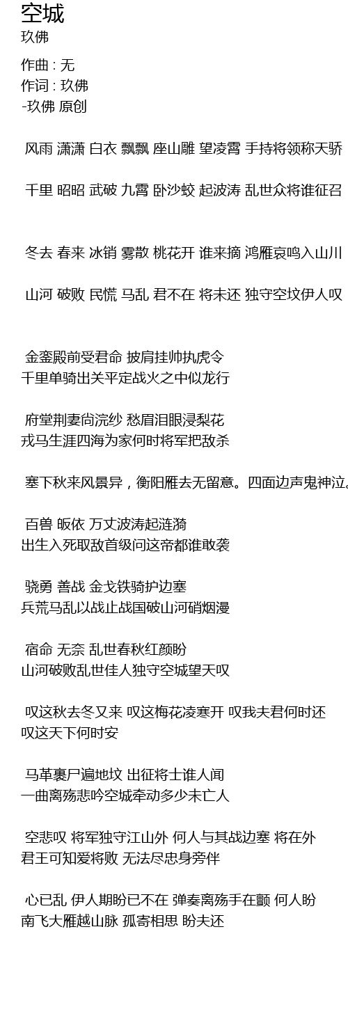 | 马革裹尸遍地坟 出征将士谁人闻 一曲离殇悲吟空城牵动多少未亡人 | |