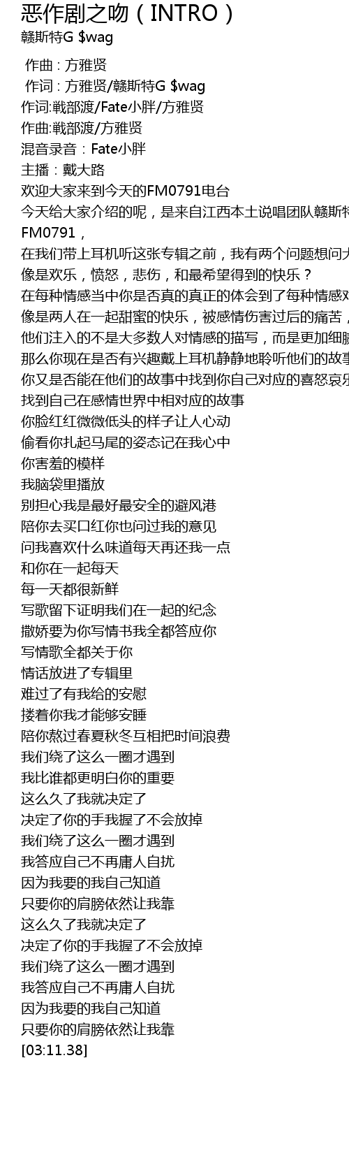 | [00:03.11] | 欢迎大家来到今天的FM0791电台 |