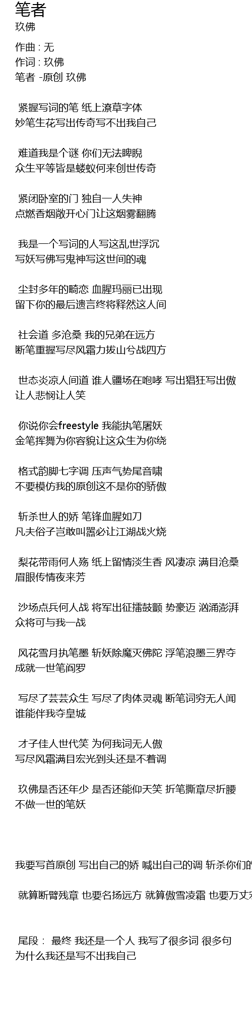 | 尾段: 最终 我还是一个人 我写了很多词 很多句 为什么我还是写不出我自己 |