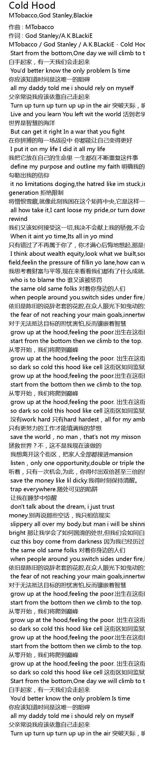 | [01:20] | grow up at the hood,feeling the poor.出生在这街区,白手起家 |