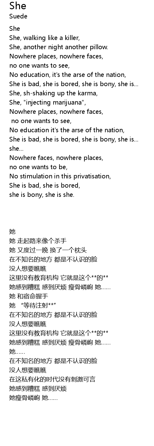 | [01:35.69] | She is bad, she is bored, she is bony, she is... |
